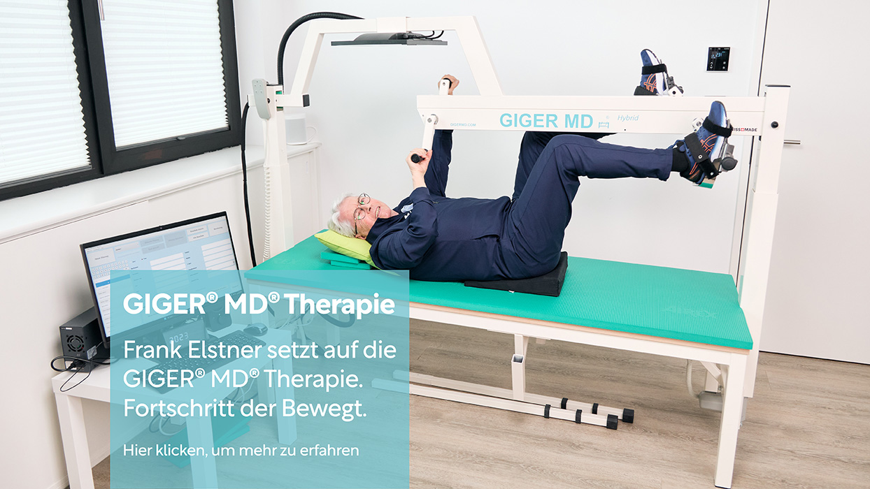 Die GIGER MD® Therapie eröffnet Betroffenen eine wissenschaftlich anerkannte Möglichkeit, den Verlauf der Krankheit stark zu verlangsamen oder gar aufzuhalten und bereits verloren geglaubte Fähigkeiten wiederzugewinnen. Der Schlüssel dazu ist regelmässiges Training mit den hochentwickelten GIGER MD® Therapieinstrumenten – schonend, schmerzfrei und von jedem durchführbar.